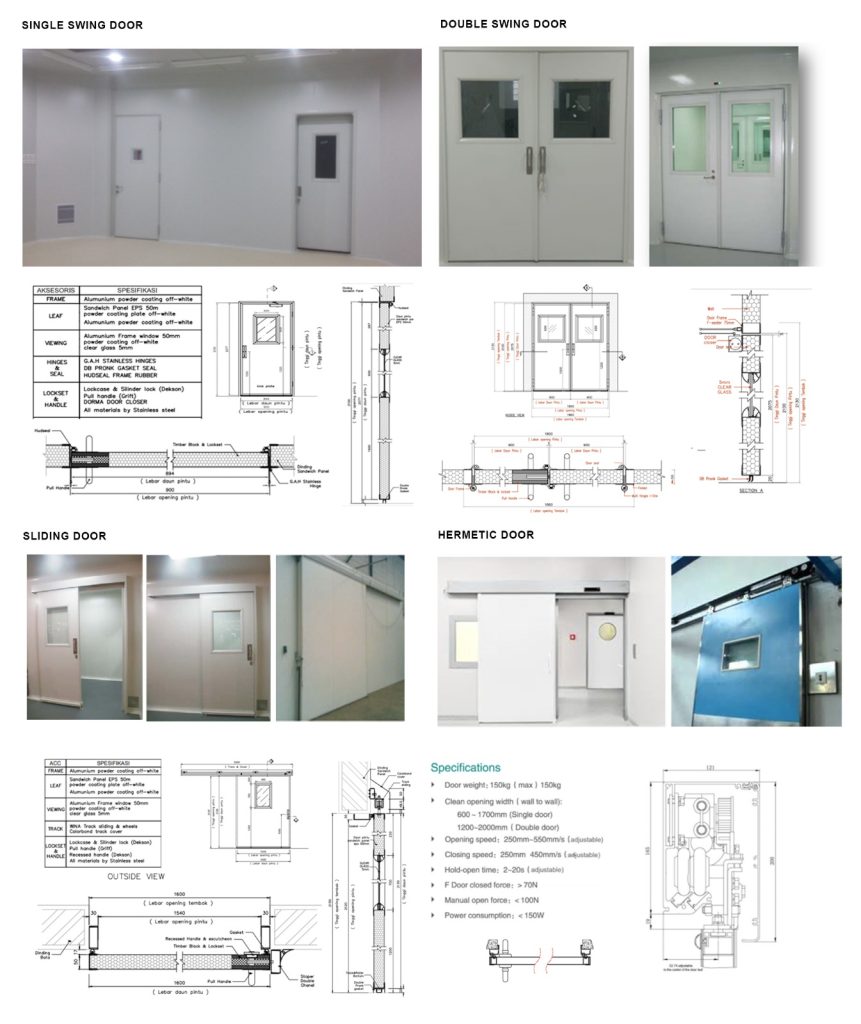 Pintu Ayun (Swing Doors): Sering digunakan di area dengan lalu lintas personel rendah hingga sedang. Penting untuk memastikan desain flush (rata) dengan dinding panel dan penggunaan engsel non-shedding.